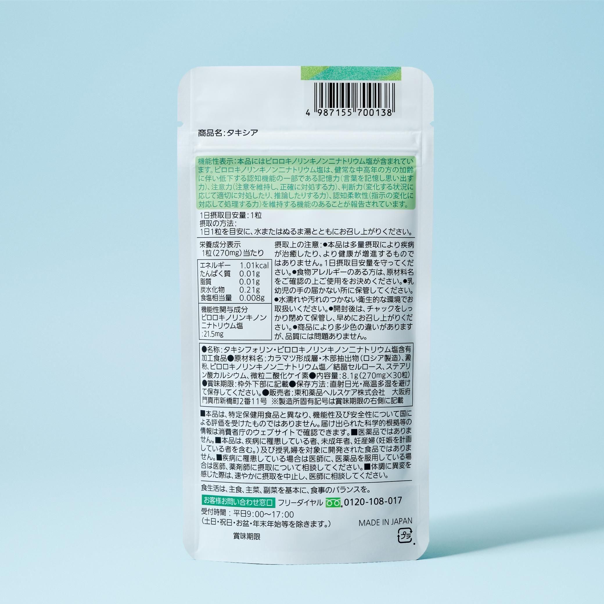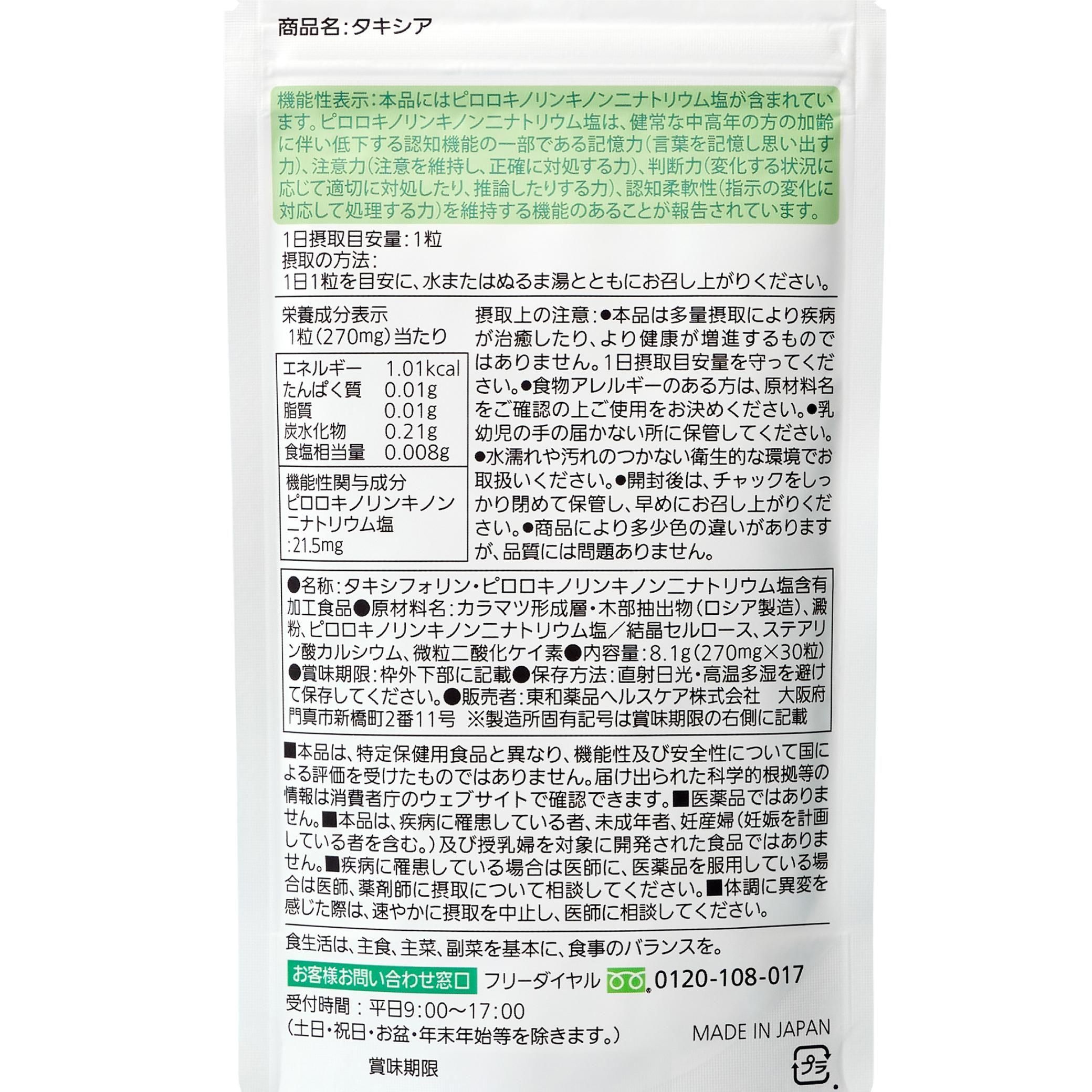 - 本品にはピロロキノリンキノン二ナトリウム塩が含まれています。ピロロキノリンキノン二ナトリウム塩は、健常な中高年の方の加齢に伴い低下する認知機能の一部である記憶力(言葉を記憶し思い出す力)、注意力(注意を維持し、正確に対処する力)、判断力(変化する状況に応じて適切に対処したり、推論したりする力)、認知柔軟性(指示の変化に対応して処理する力)を維持する機能のあることが報告されています。
