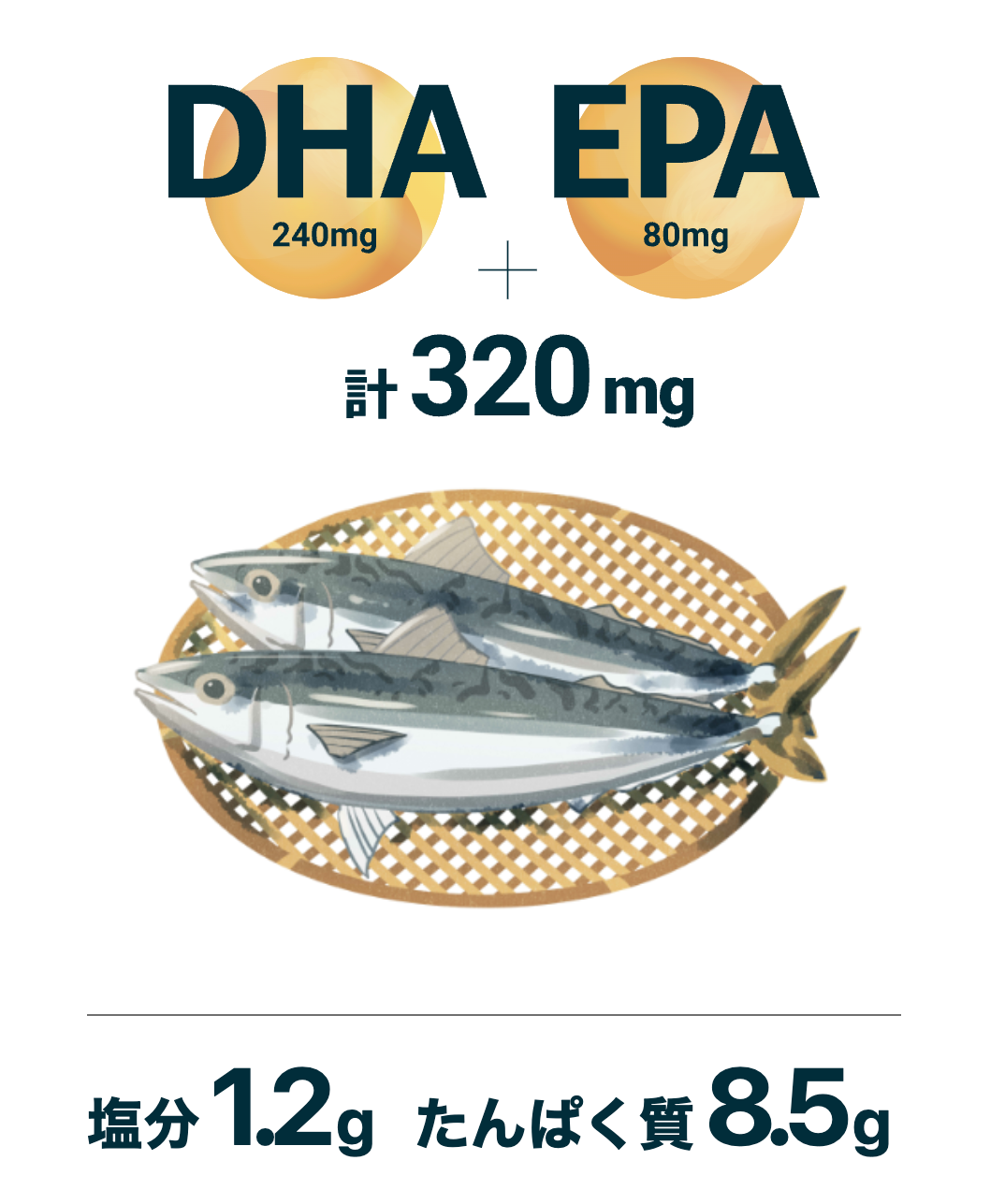 本品(1食160g)には、原材料のサバ由来のDHA・EPAが1食あたり合計320mg含まれています。(※3)